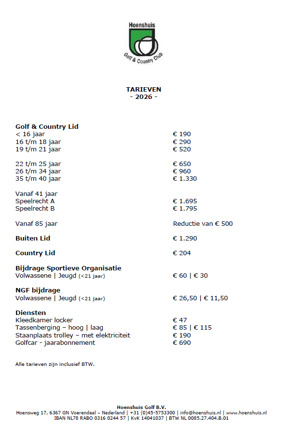 | Een nieuw Lid dient bij toetreding tot de Club een eenmalig Speelrecht te voldoen en heeft hierbij de keuze tussen 'A - €1.815' of 'B - €1'. Speelrecht 'A' biedt vanaf 41 jaar een korting op de jaarlijkse contributie.